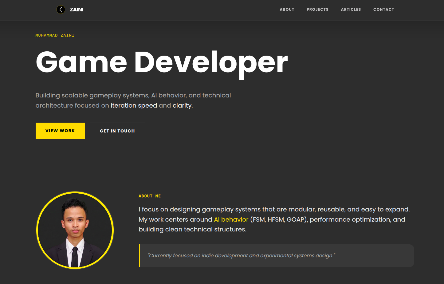 ![Alt: Screenshot of Muhammad Zaini's LinkedIn profile showing the consistent dark theme and yellow accent colors] ![Alt: Screenshot of Muhammad Zaini's GitHub profile showing the same visual identity and "ζ" logo]